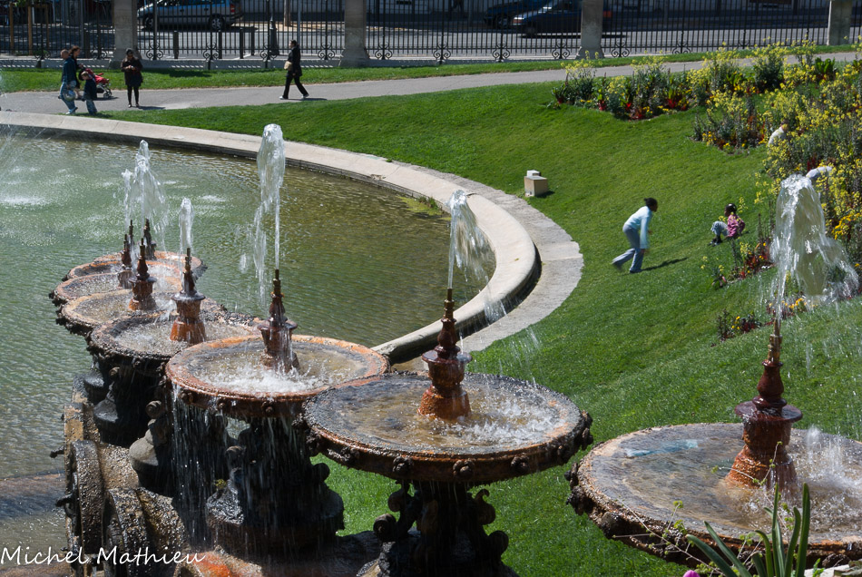 Cages aux ours. Les fontaines bleues sont la mémoire du parc Longchamp, évoquée au travers d'une création. La mémoire grecque de la cité phocéenne, la mémoire de l'arrivée providentielle de l'eau à Marseille, la mémoire de l'ancien jardin zoologique.