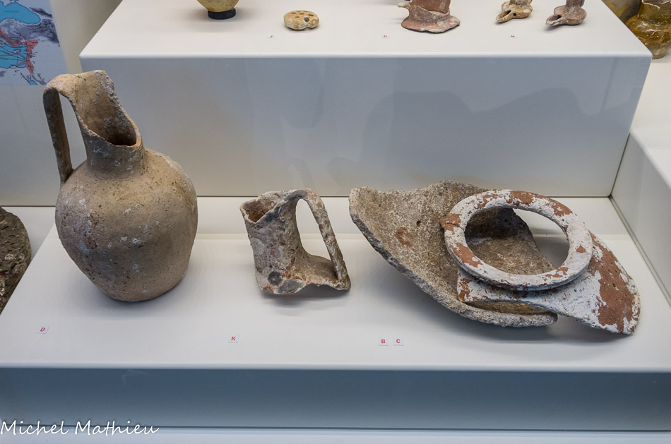 Deux urnes en pâte claire, cruches (A), hydrie (B) et une cruche punique importée d’Ibiza (C) recelaient des ossements incinérés d’adultes. Dans la cruche en pâte claire massaliète (D) ont été retrouvés les reste d’un bébé prématuré.