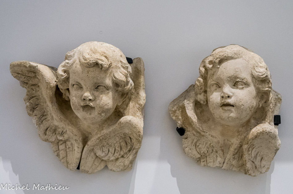 Cette vasque flanquée de têtes est la cuve d'un bénitier qui est supporté par la colonne décorée de têtes d'angelot et de draperies. Dans l’église, les deux bénitiers se faisaient face.