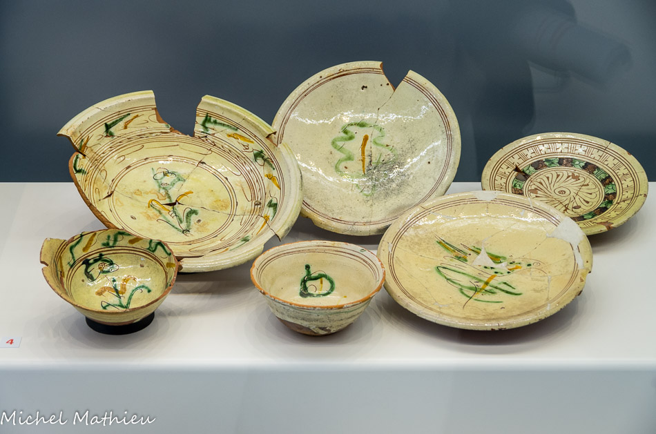Céramiques. Assiettes, coupe et plat inspirés des décors « à sgraffite » pisans (D), assiettes à décor de points (E).