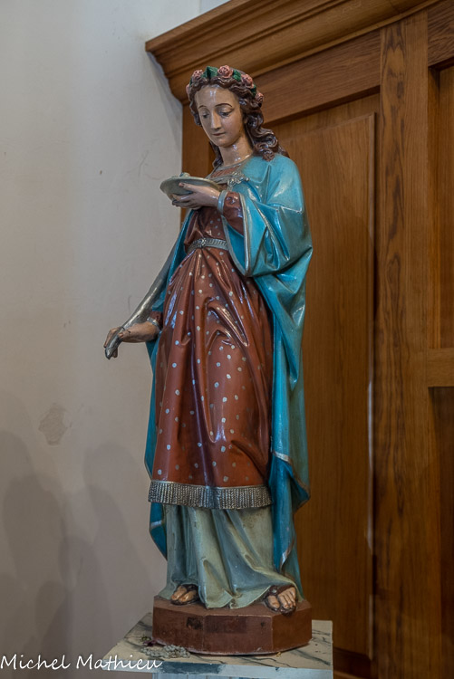 Statue de sainte Lucie. Elle est également appelée Luce. Elle porte ses yeux sur un plat, ainsi que la palme du martyr. Elle a souffert le martyre au début du IVe siècle, lors des persécutions de Dioclétien.