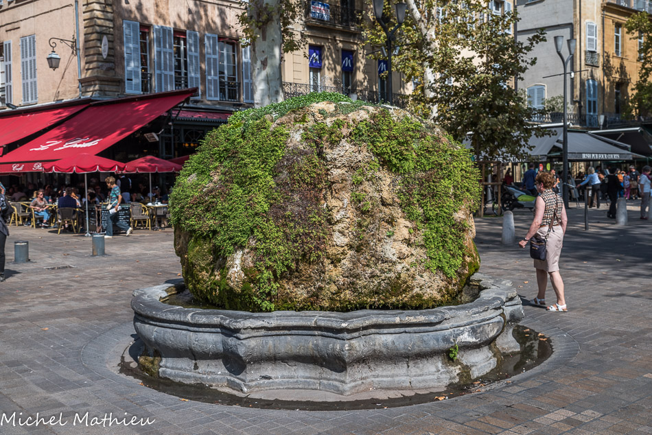 Fontaine « moussue », cours Mirabeau. Elle doit son nom à la mousse verte et épaisse qui la recouvre. Elle est alimentée par la source thermale chaude à 23°C des Bagniers. Cette fontaine est l'oeuvre de l'architecte Fossé en 1667. Cette fontaine était à l’origine ornée d'un triton, détruit nuitamment par des gens pris de boisson. En 1670, elle reçut quatre angelots supportant une vasque de pierre. Cette fontaine avait une importance particulière, car placée sur le "cours à carrosses", promenade de plaisir et de parade, et dans l'axe de la rue centrale du nouveau quartier Mazarin, résidence des parlementaires. Il fut donc décidé en 1687 d'y amener les eaux chaudes jusque-là crachées par la fontaine des Bagniers. Son aspect lui vient de la prolifération de mousse et de calcaire due à une eau à 18 degrés. En 1708 un décret interdit, non sans difficultés, que les ménagères viennent y faire leur lessive.