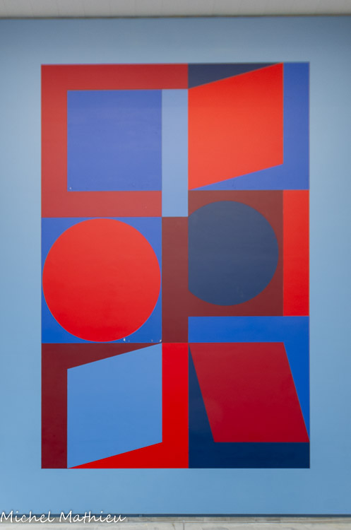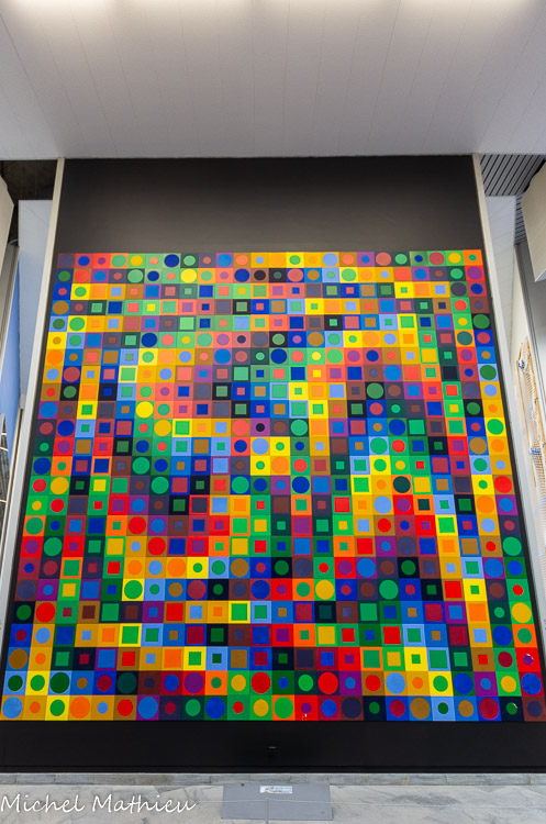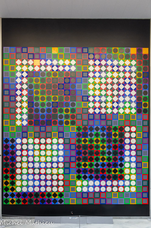 Salle centrale, au cœur des intégrations. De cette alvéole, le visiteur peut voir les 6 autres cellules. Cet agencement est original pour l’époque, celui d’avoir conçu cette fluidité de circulation pour une liberté totale de déambulation d’une salle à l’autre. Ces œuvres font partie de la période issue du « Folklore planétaire ». Victor Vasarely invente un alphabet composé de 30 formes géométriques différentes qu’il associe à 30 couleurs sélectionnées. À partir de ce registre, il met au point une unité de base appelée « unité plastique », faite de formes et couleurs assemblées. L’alphabet intuitif au départ, se change en abécédaire breveté en 1959.