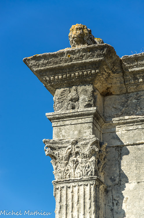Calcaire, dont pierre de Calissanne. Des véhicules de l'armée américaine ont détruit le portique nord à leur passage en 1945.