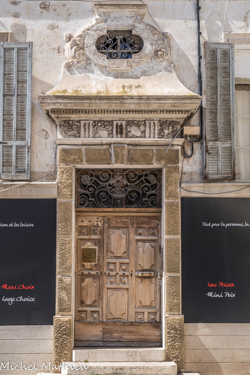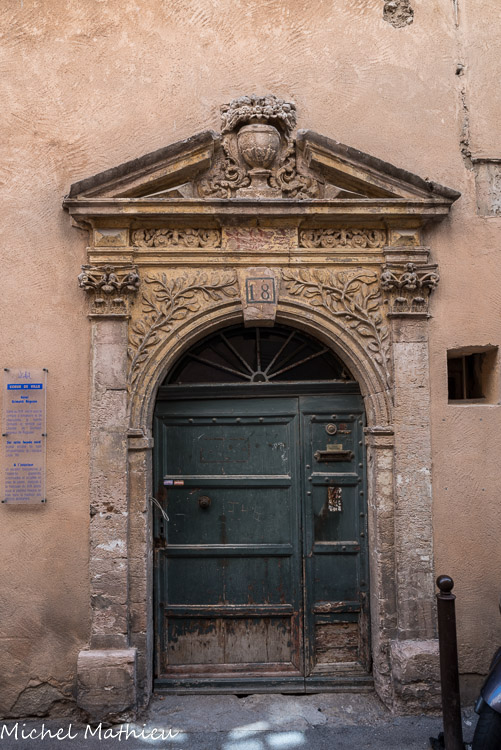 Entrée de l'ancien hôtel de Grimaldi-Régusse édifié au XVIIe siècle. Portail sculpté de type ornementaliste de l'époque de Louis XIV.