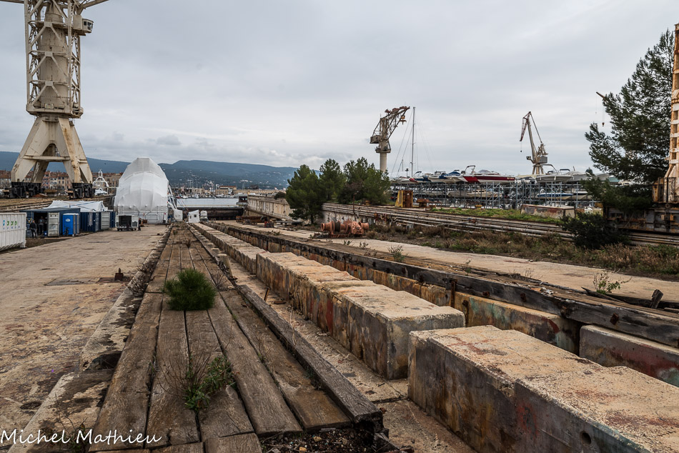 Aujourd’hui, le chantier naval de La Ciotat accueille 41 entreprises privées, pour 600 employés et plus du double de sous-traitants. Le site est passé de 90 bateaux en 2004 à 500 escales en 2014, dont 300 mises à sec. Il génère un chiffre d’affaires de 70 millions d’euros et se positionne comme le premier chantier naval d’Europe et un acteur mondial de premier plan. Emplacement de la cale n°2. Reconstruite en 1952, elle faisait 172m de long sur 31m de large, elle permettait la construction d’unités de 32.000 tonnes et comprenait 3 grues de 3 à 7 tonnes, une grue de 90 tonnes et celle de 120 tonnes de la cale n°1 (sur la photo). A gauche, la grue qui s'est pliée et qu'il a donc fallu renforcer.