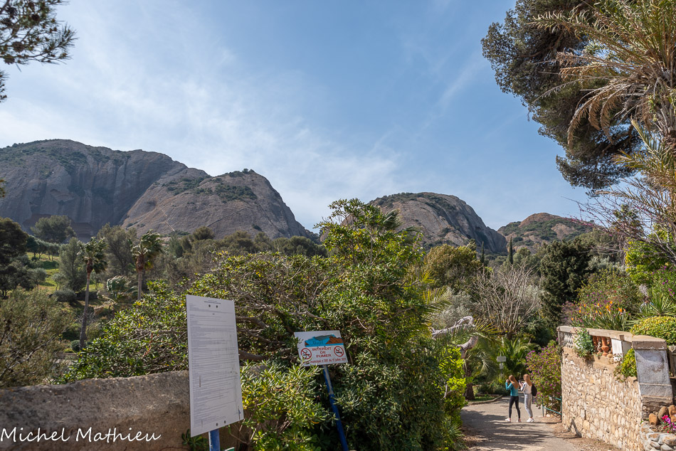 Entrée du parc. Autrefois propriété privée, le parc du Mugel est depuis 1987 aménagé et entretenu avec soin par la municipalité de la Ciotat, ce qui lui a valut d’être classé « Jardin remarquable ».