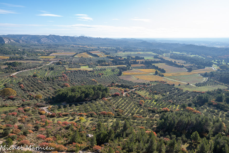 Sur la gauche s’étend la plaine de la Crau. Sa partie aride abrite une flore et une faune exceptionnelles alors que sa partie irriguée accueille des troupeaux de moutons mérinos qui, l’été, montent dans les Alpes. Plus au sud, derrière les collines, la vallée était traversée par la via Aurelia, la route antique tracée par les Romains.