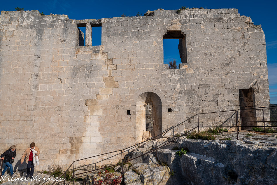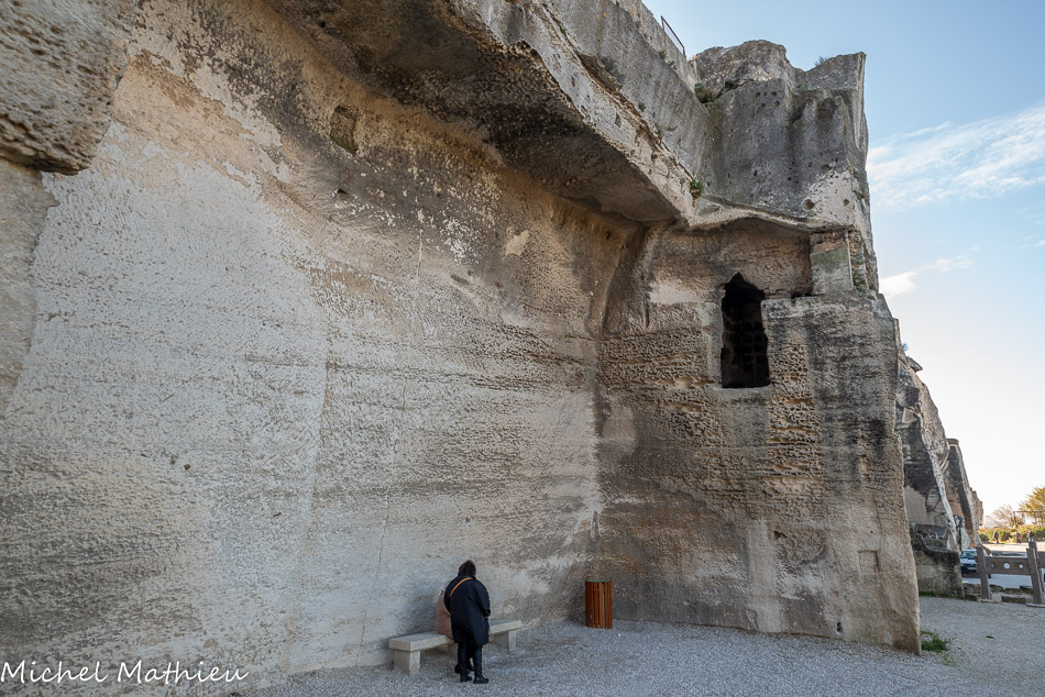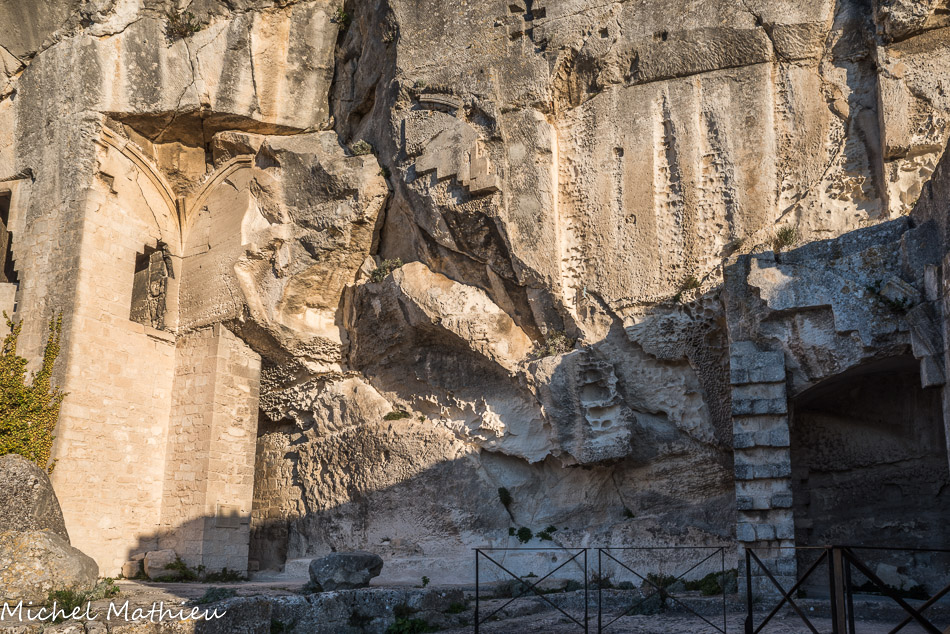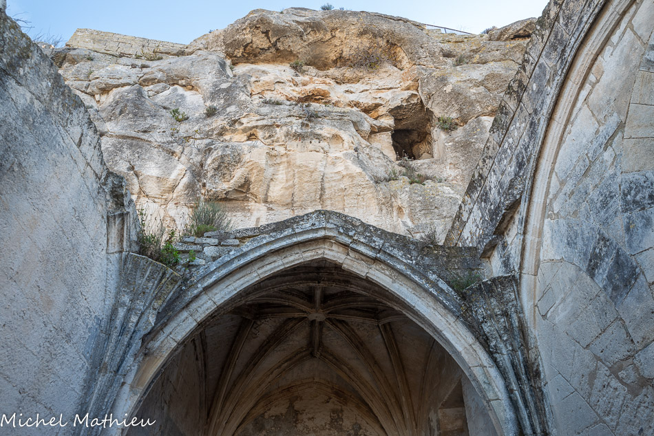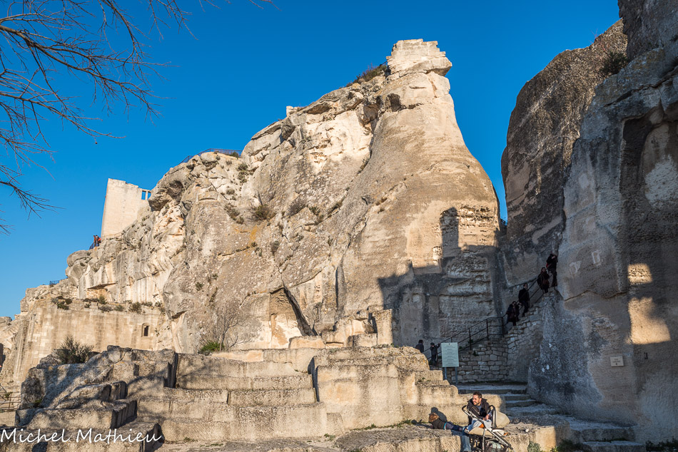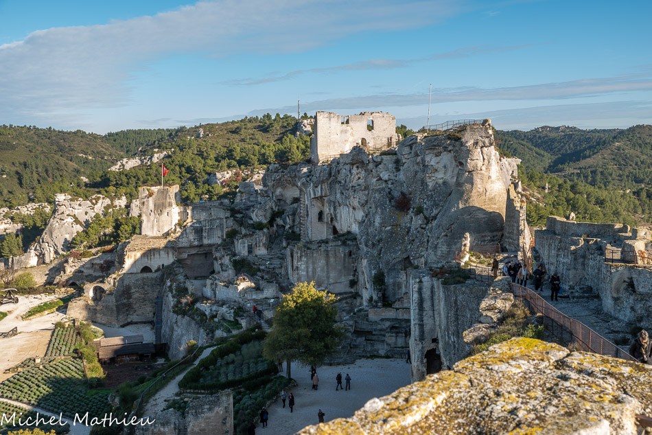 Les Baux. Le Château. Le donjon. Pour construire le donjon, les seigneurs des Baux avaient fait tailler le rocher donnant sur le vallon sur une hauteur pouvant atteindre 20 mètres, pour défier toute escalade. Il est en grande partie rupestre. Pour le construire, le rocher a largement été évidé. Les pierres étaient donc à disposition, prête à être taillées à une époque où de nombreux châteaux sont encore construits en bois. Les carrières, en effet, étaient souvent éloignées et le transport coûtait cher. Au premier niveau, le donjon ne comportait qu’une pièce, mais à partir du premier étage, il y en avait trois et ses dimensions étaient alors de 35 mètres sur 12.