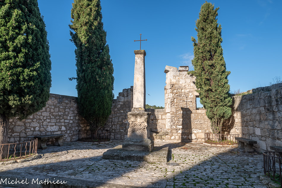 Fenêtre Post Tenebras Lux surmontée de l’inscription Post tenebras lux 1571 (« Après les ténèbres, la lumière – 1571 »), devise calviniste ; cette maison fut la propriété de Brisson Peyre (ou Jean de Manville), laboureur, en 1571, et a été cédée en 1584 à Charles Laugier, lieutenant du viguier des Baux. Maison de Claude II, sa femme est enterrée à Saint-Vincent.