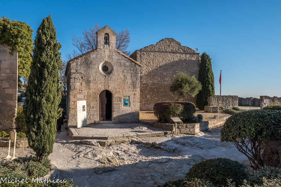 Chapelle des Trémaïé. Les Trémaïé (provençal Tremaïe, /tramaje. « Trois Maries ») sont un bas-relief rupestre daté de l'époque gallo- romaine. Comme le rocher se trouve dans une position instable, menaçant de continuer à rouler une chapelle lui est accolée depuis le XIXe siècle, 1845 précisément, afin de le stabiliser complètement. De1830, début du culte catholique lié aux Trémaïé, jusqu'à 1910 environ, les habitants des Baux y effectuaient un pèlerinage tous tes 21 mai. Pour l'occasion, ils portaient une petite statue polychrome représentant la barque sur laquelle les Trois Maries débarquèrent en Provence.
