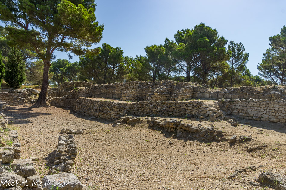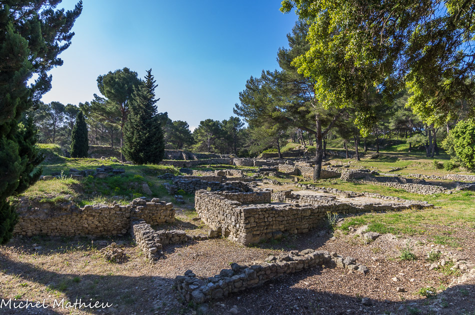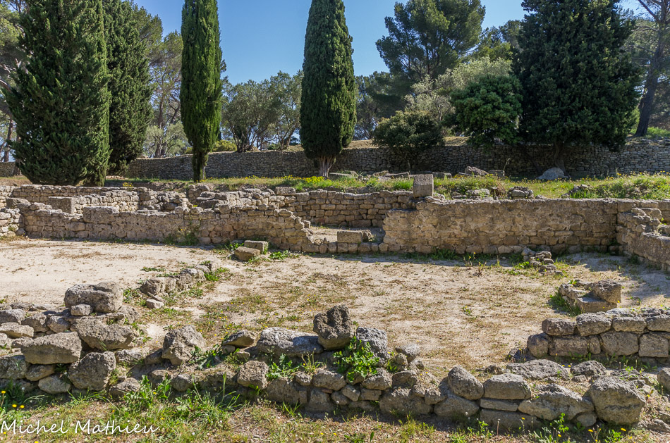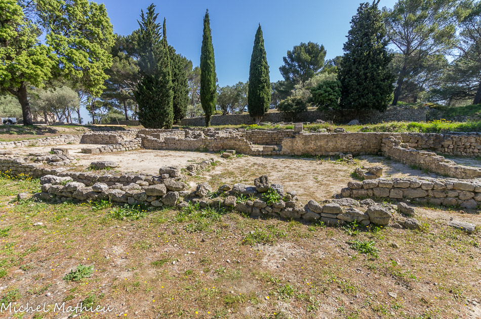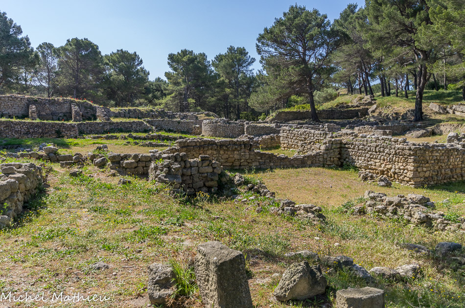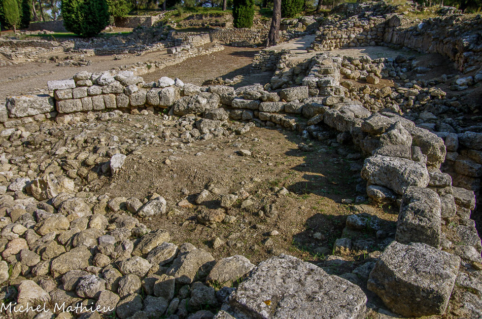 Vestiges d'une habitation gauloise, VIe av J.C. La superficie dégagée à ce jour dans la Ville-Haute est de 2 500 m2. Elle a livré une habitation primitive (c'est le terme d'Henri Rolland), recoupée par les remparts hellénistiques. Elle paraît composée de deux espaces adjacents, mais bâtis de manière très différente : une pièce principale (servant de séjour ?) construite en dur et un petit espace où se trouvait un foyer (la cuisine ?), simplement délimité par une rangée de pierres dressées de chant, qui a dû être gagné sur la zone de circulation extérieure.