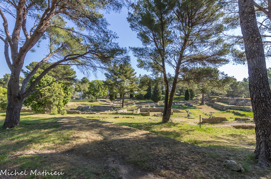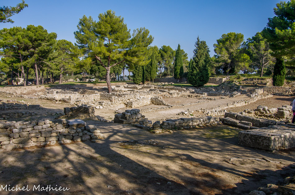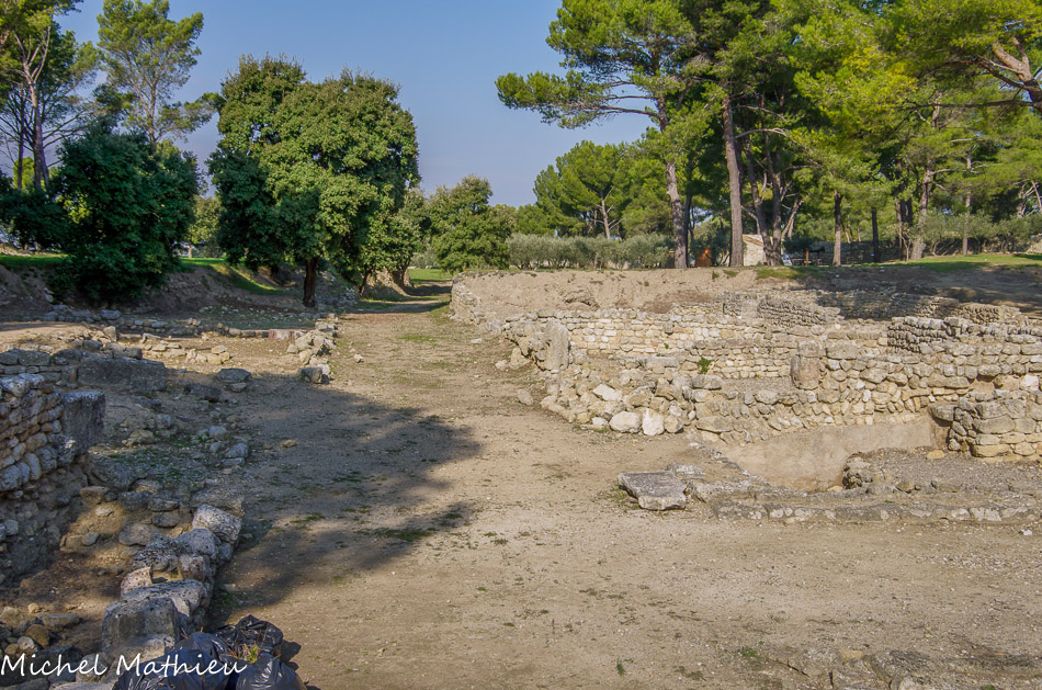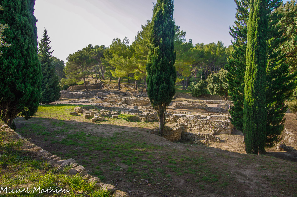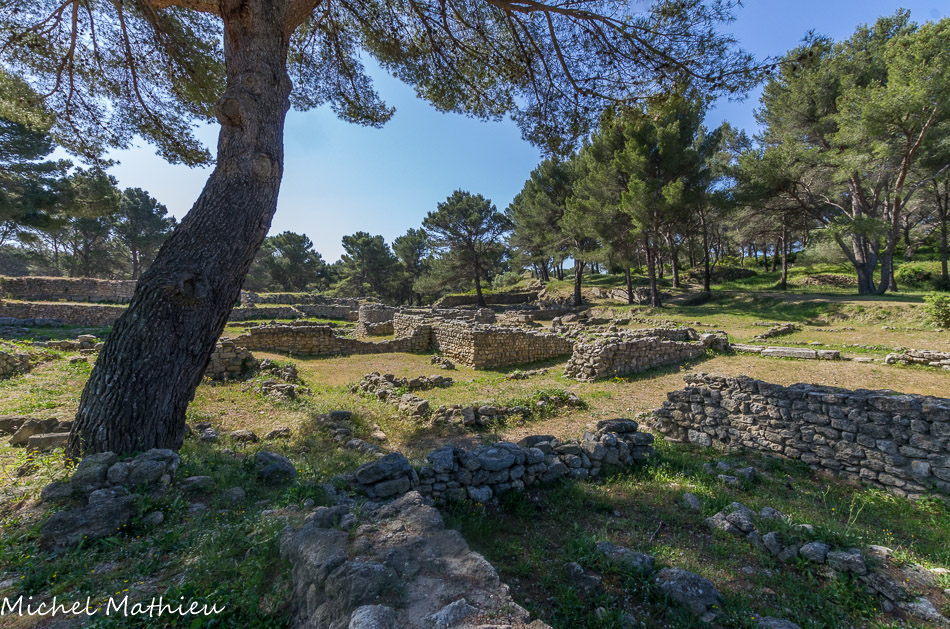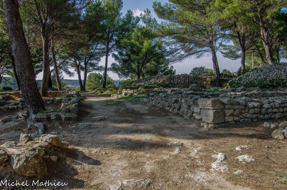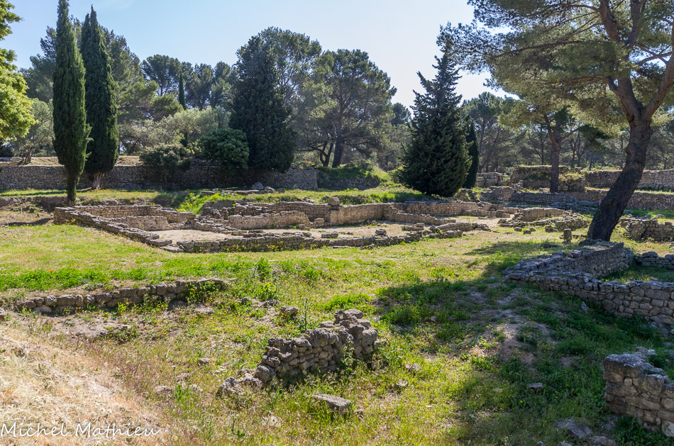 Vestiges d'une habitation gauloise, VIe av J.C. La superficie dégagée à ce jour dans la Ville-Haute est de 2 500 m2. Elle a livré une habitation primitive (c'est le terme d'Henri Rolland), recoupée par les remparts hellénistiques. Elle paraît composée de deux espaces adjacents, mais bâtis de manière très différente : une pièce principale (servant de séjour ?) construite en dur et un petit espace où se trouvait un foyer (la cuisine ?), simplement délimité par une rangée de pierres dressées de chant, qui a dû être gagné sur la zone de circulation extérieure.