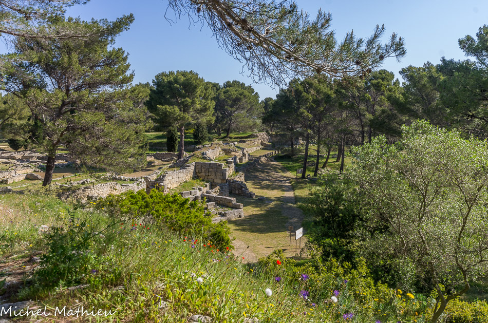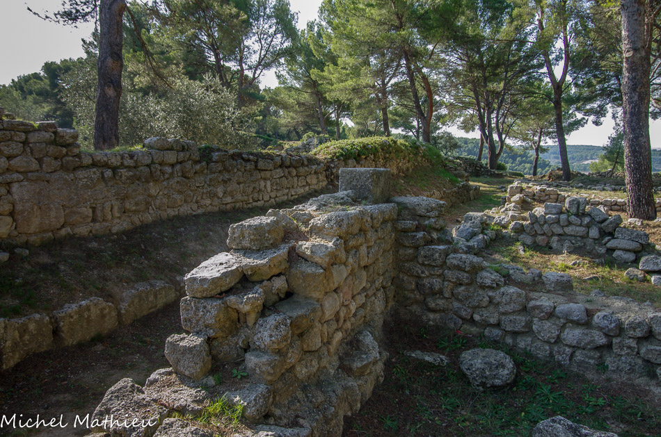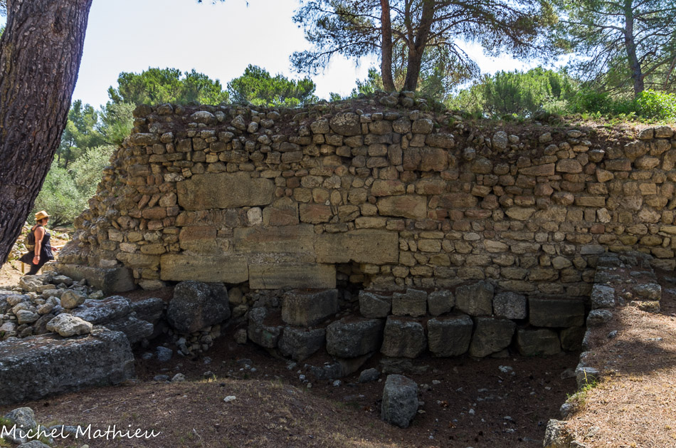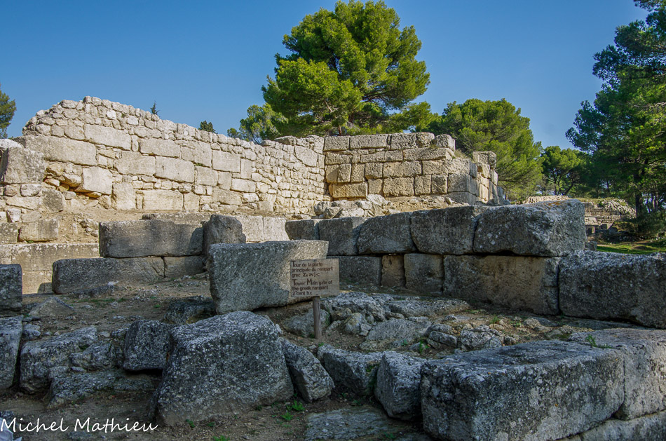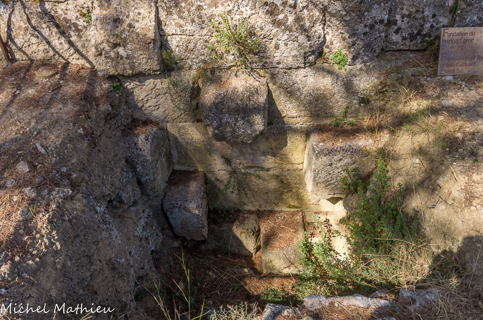 La porte principale de l'oppidum gaulois (VIe-IIe siècles av J.C.). Rempart grec en grand appareil. Derrière, le mur paléochrétien.