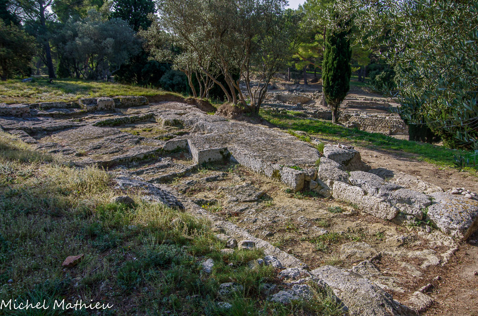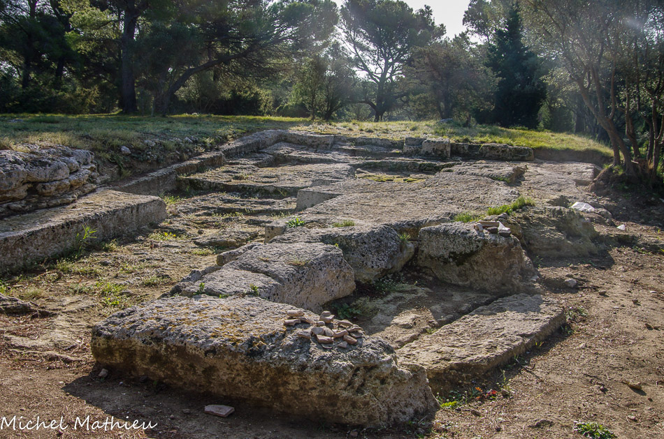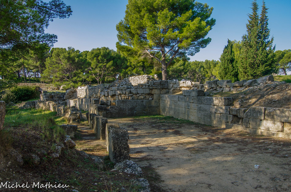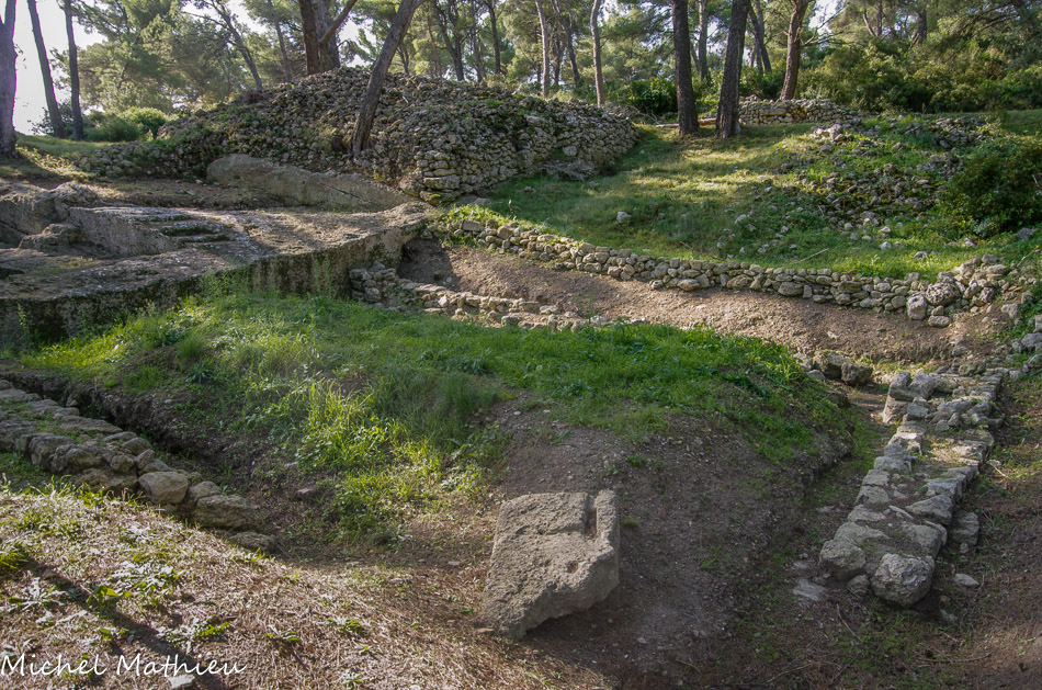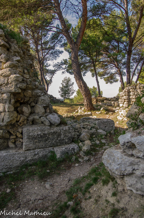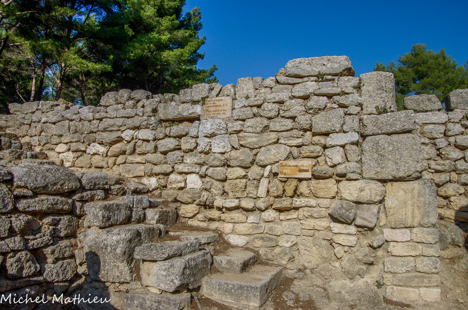 La porte principale de l'oppidum gaulois (VIe-IIe siècles av J.C.). Rempart grec en grand appareil. Derrière, le mur paléochrétien.