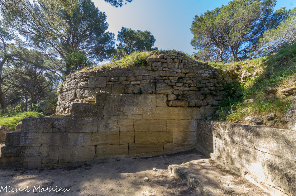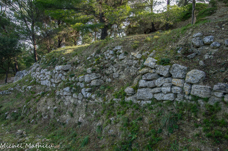 Parement intérieur du rempart grec, IIe av J.C. avec en dessous, le "tumulus de cendres" du VIe et Ve s. av. J.C. C'est sans doute une altrenance de couches de dépotoirs et de sols appartenant à des habitations. On est à un endroit d'interruption et d'inachèvement du rempart hellénistique.