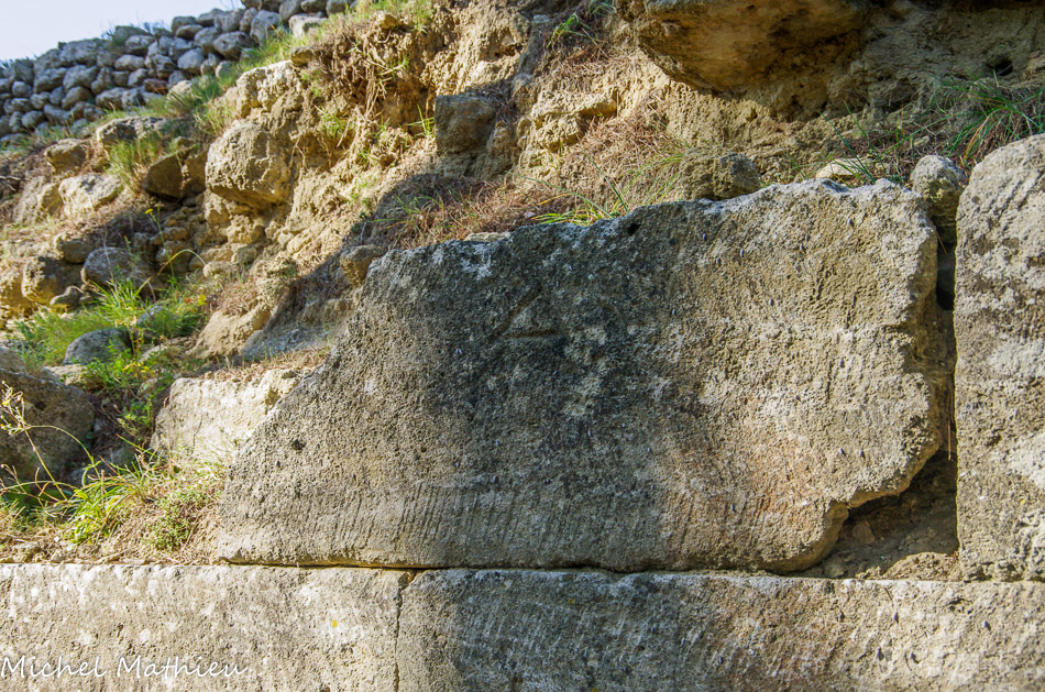 Dans le rempart primitif, on rencontre des pierres chanfreinées d'anciens monuments funéraires gaulois (stèles). Les a-t-on utilisées en souvenir des premiers habitants du site ?
