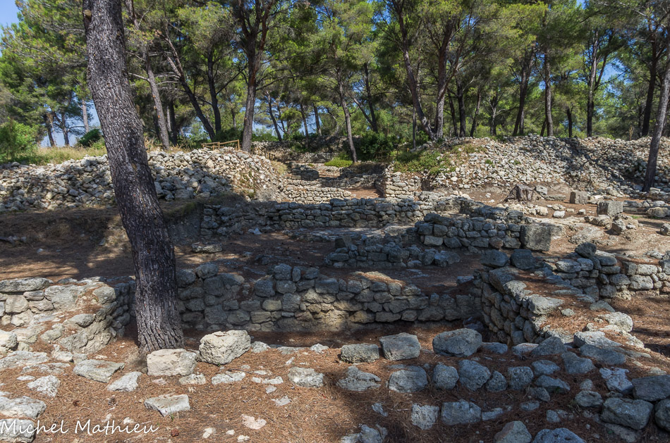 Bastion polygonal du rempart grec. La fortification hellénistique forme le monument majeur de cette agglomération. À peu de chose près, elle suit le tracé et la conformation du rempart archaïque, ce qui a permis de dire qu'elle en constituait l'habillage monumental. Sur ce plan, deux exemples sont éloquents : l'impressionnant bastion polygonal sud, qui englobe au moins une tour primitive, et la porte principale et médiane dont le plan reprend celui de l'ouvrage antérieur.