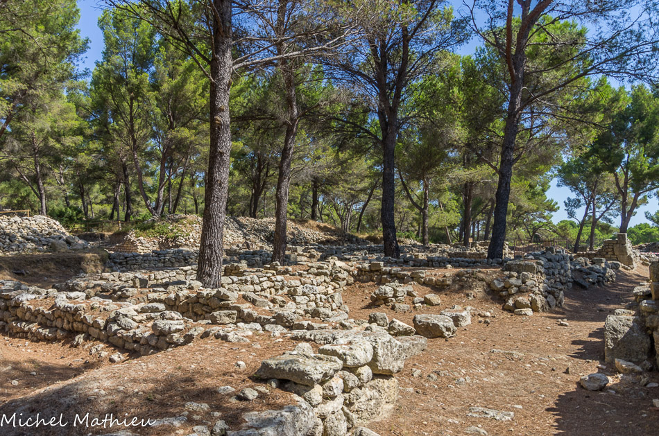 La ville basse. Près de la porte de la Ville-Basse, se côtoient, semble-t-il, au sein d'îlots allongés, des maisons rectangulaires à pièce unique, couvrant une petite superficie (12 à 15 m²) et d'autres, peut-être à pièces communicantes, pourvues d'une paroi en forme d'abside.