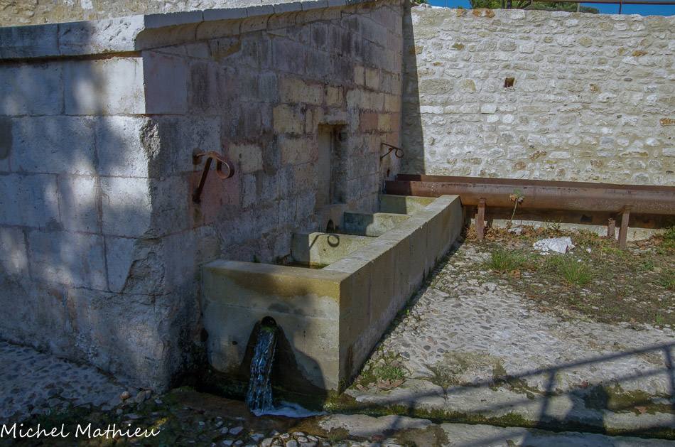 La fontaine de l'Arc. Elle se compose également de deux réservoirs voûtés dans lesquels plusieurs ouvertures permettaient le puisage de l'eau. Le bâtiment de cette fontaine abritait à l'étage un système de pompe alimentant un petit aqueduc qui desservait le lavoir de Tholon.