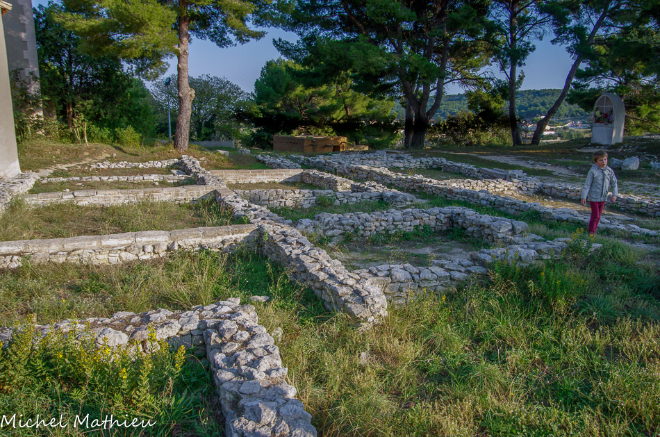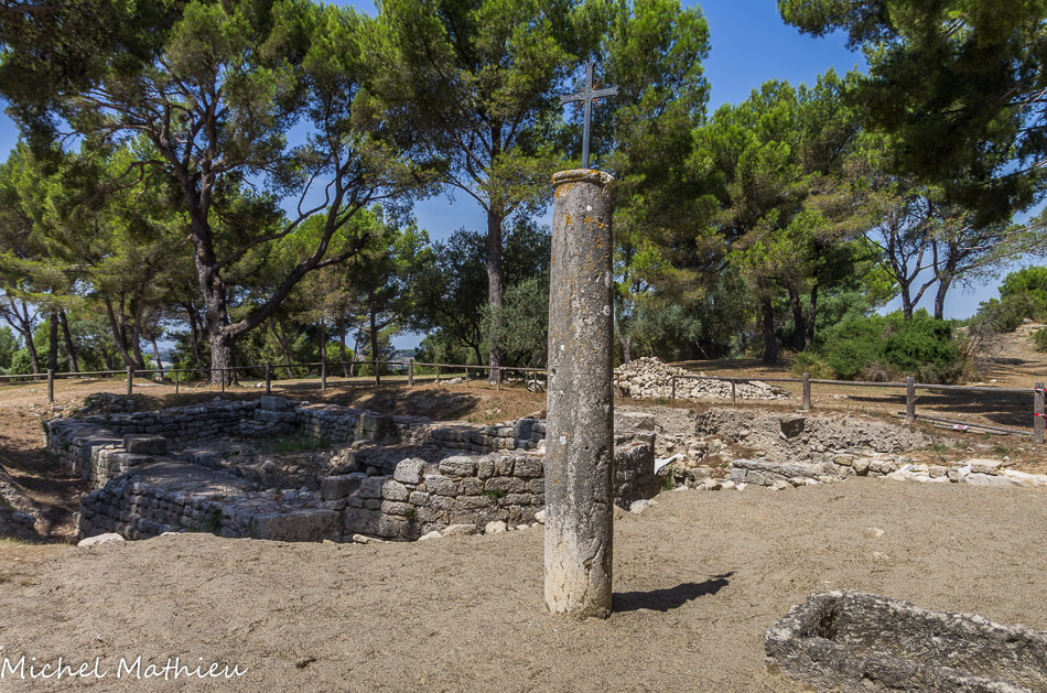 Tombes rupestres d'époque paléochrétienne (Ve-VIIIe s. apr. J.-C.). Nous ne savons rien de la nécropole gauloise, mais Henri Rolland a dégagé une partie du cimetière de la ville d'Ugium, un des plus importants du Midi de la France. Hormis quelques sépultures placées près de la chapelle Saint-Blaise, c'est surtout au sud et à l'est des remparts que l'on peut encore découvrir près de 300 tombes, dispersées sur le plateau de Castillon, dans un environnement de carrières et de voies à ornières.