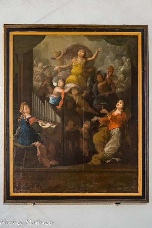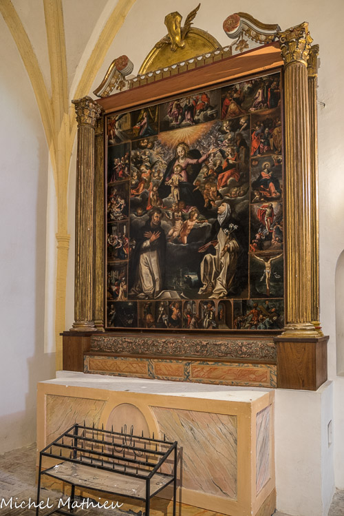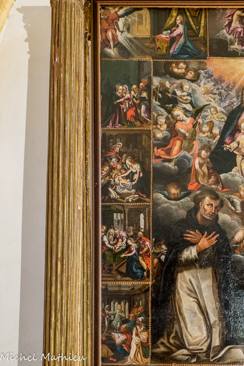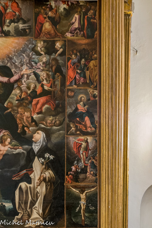 La chapelle du Rosaire. Tableau la Madone du Rosaire : une multitude d’anges célèbrent le triomphe de Marie placée en leur centre et qui révèle à Saint- Dominique, Sainte-Catherine de Sienne la dévotion dévolue au monde catholique. Cette composition est représentée dans 15 médaillons très détaillés sur les mystères du Rosaire : ce mystère du Rosaire ou de la vie de la Vierge, est une dévotion répandue à la fin du XIIe et propagée par les Dominicains.