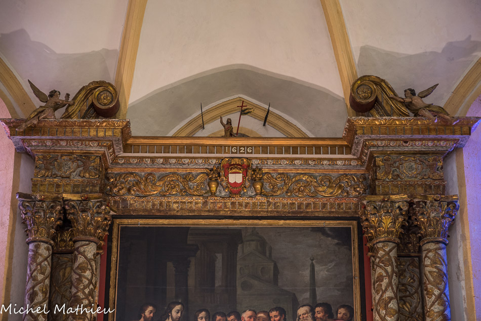 La chapelle du Rosaire. La Madone du Rosaire du XVIIe siècle - restaurée en 1995 Retable sculpté, peint et doré en forme de portique à colonnes droites cannelées d’ordre corinthien représentant un travail remarquable (école du Midi)