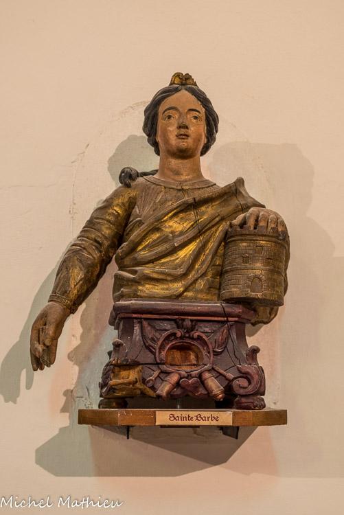 La chapelle du Purgatoire. Buste reliquaire de sainte Barbe tenant une tour dans ses bras, daté de 1740.