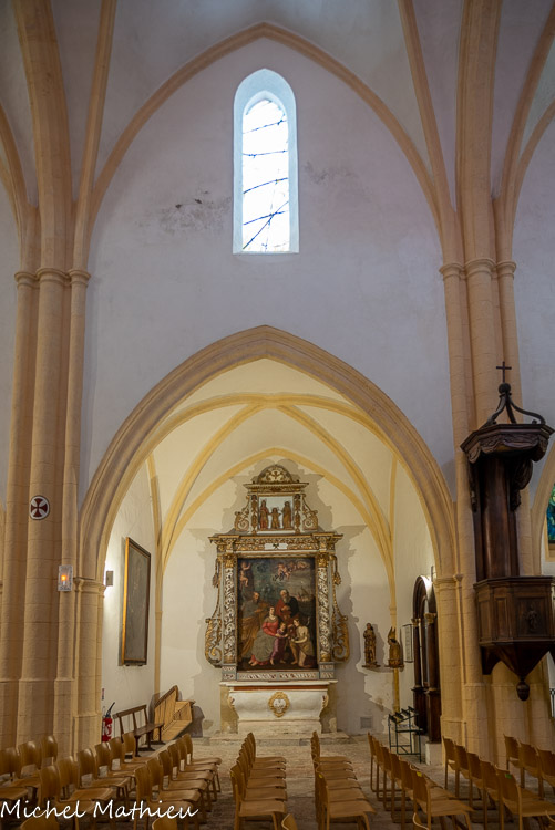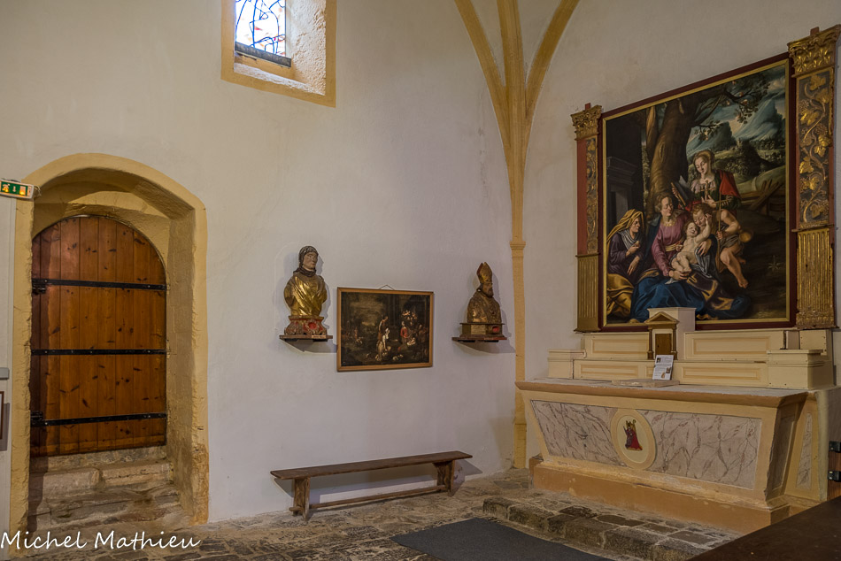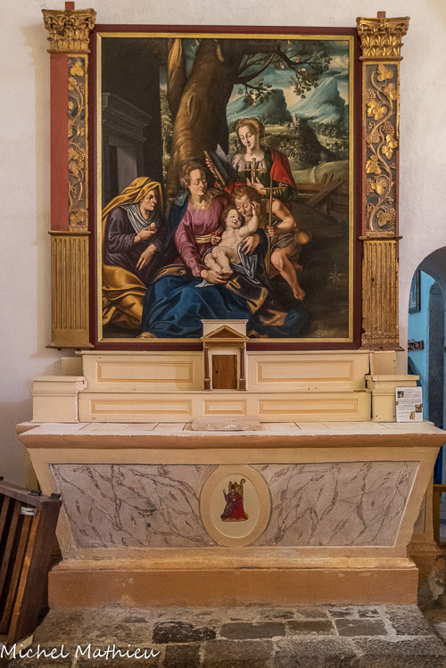 Il ressemble à une tapisserie des Gobelins et représente une Sainte Famille : une vieille Dame, Sainte Anne, offre une poire à l’Enfant Jésus, assis sur les genoux de la Vierge. Saint Jean Baptiste s’amuse avec lui. Elisabeth, debout, contemple la scène. Sa figure est celle de la principale bienfaitrice de la chapelle. Les dames sont en costume du XVIe siècle.