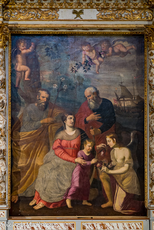 La chapelle Saint-Joseph. Un tableau représentant la Sainte Famille (La Vierge et St Joseph) avec des Anges et un saint Joachim, le père de la Vierge. Une galère constitue l’arrière-plan de la scène. Au sommet de son mât, la présence du drapeau à « fleur de lys or » indique qu’il s’agit d’une œuvre exécutée par une école du Midi de la France. Ce tableau peut être interprété comme un ex-voto offert à la Sainte Famille : un ange offre à l’enfant Jésus un panier remplit de fruits et de fleurs.