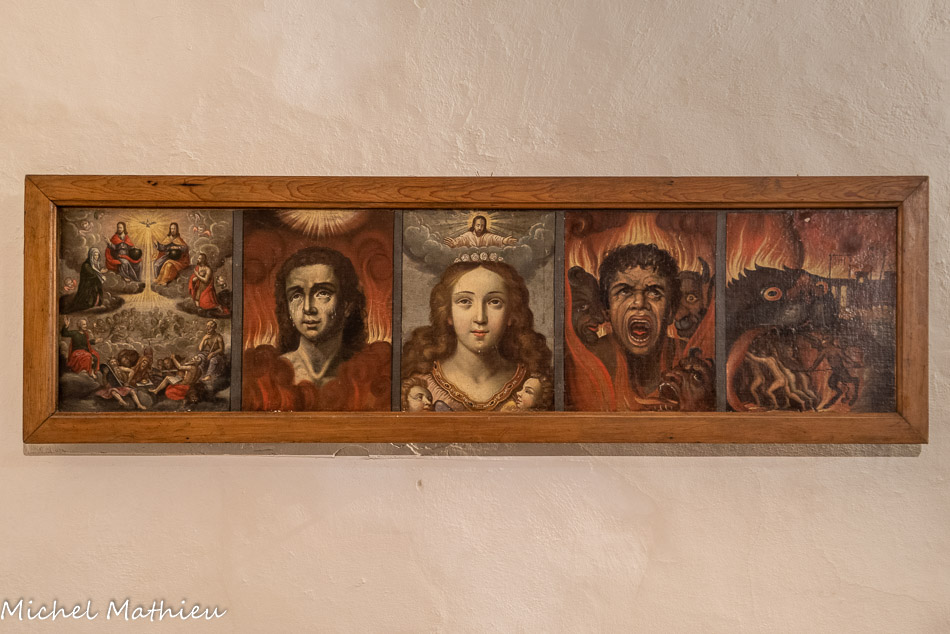 La chapelle du Purgatoire. Sur le mur Sud une prédelle du XVIIe siècle - CMH en 1911 - qui peut être attribuée à G.Greve et où l’enfer est peint dans un genre du XVe. Elle est divisée en 5 compartiments : 1) la résurrection des morts 2) un visage d’bomme triste et larmoyant 3) l’état d’une âme qui jouit des Félicités du ciel, sous les traits d’une jeune fille portant une couronne de roses blanches et richement vêtue. 4) une âme de damné en proie aux souffrances de l’enfer. 5) la vison de l’enfer.
