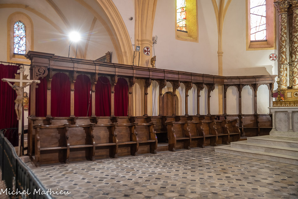 Le chœur fut orné, en 1656, d’une double galerie de stalles en noyer sculpté, due au talent de Pierre Arnaud. Elle fut réduite en 1820, aux seules vingt-six stalles entourant actuellement le maître- autel. Elles ont été classées “monuments historiques”, en 1911 et restaurées en 1962.