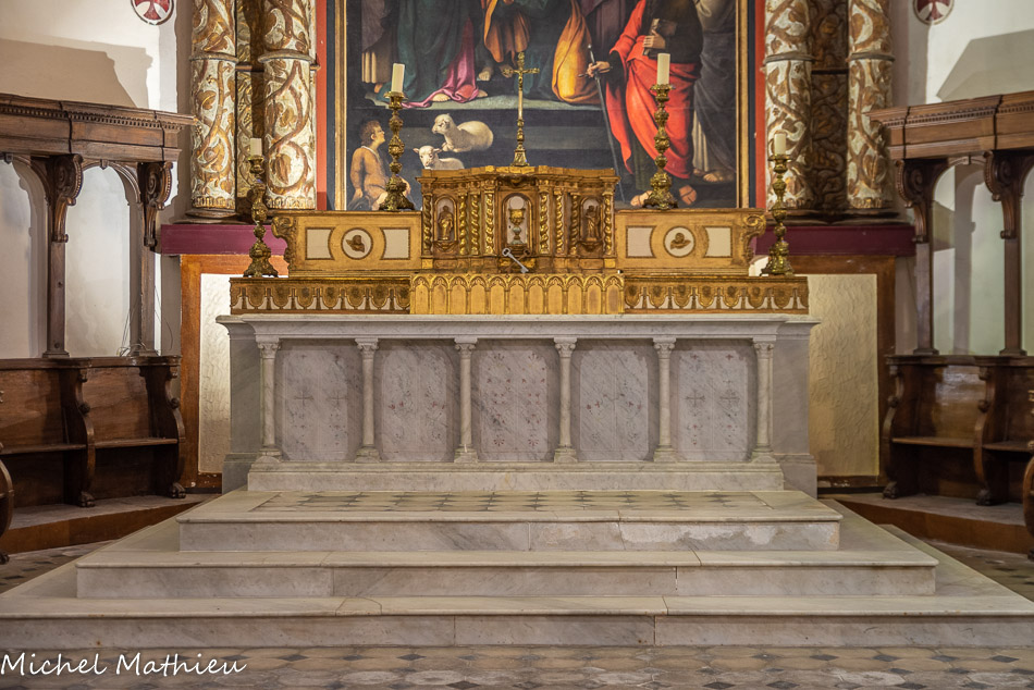Autel en marbre blanc de la fin du XIXe siècle surmonté d’une brillante ornementation en bois doré et d’un joli tabernacle du XVII°. Sous l’autel, deux caveaux renfermant les restes des prêtres et chanoines de la Collégiale
