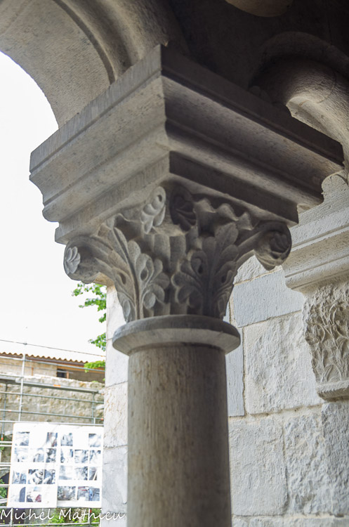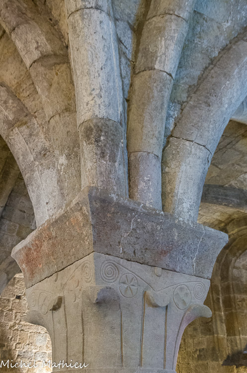 La salle capitulaire. Chapiteau orné de dessins géométriques, de style roman.