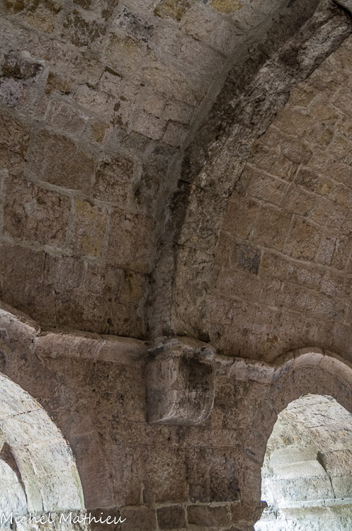 La voûte en plein cintre est renforcée par des arcs doubleaux. Les colonnes qui supportent au Sud les arcs à doubleaux sont dites « à genoux ».