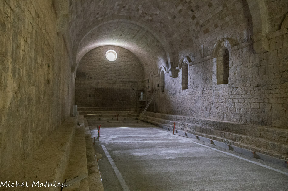 Galerie est. Un premier monastère (Monastère I) est construit à partir de la fin du XIe siècle. Ses puissantes fondations ont été retrouvées dans le réfectoire et les galeries est et sud du cloître, ainsi que dans la salle capitulaire. Cette première construction a utilisé une partie des murs de la villa romaine.