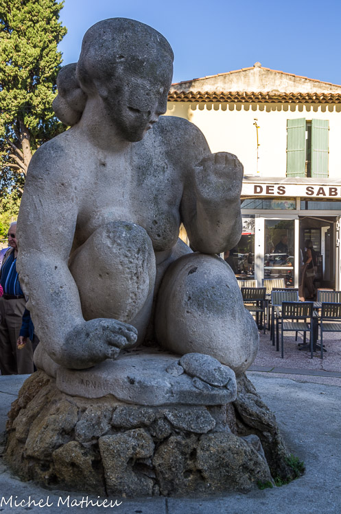 Jean Amado réalise uns sculpture en céramique vert sombre pour cette fontaine publique, avec un soubassement qui rappelle les calades.