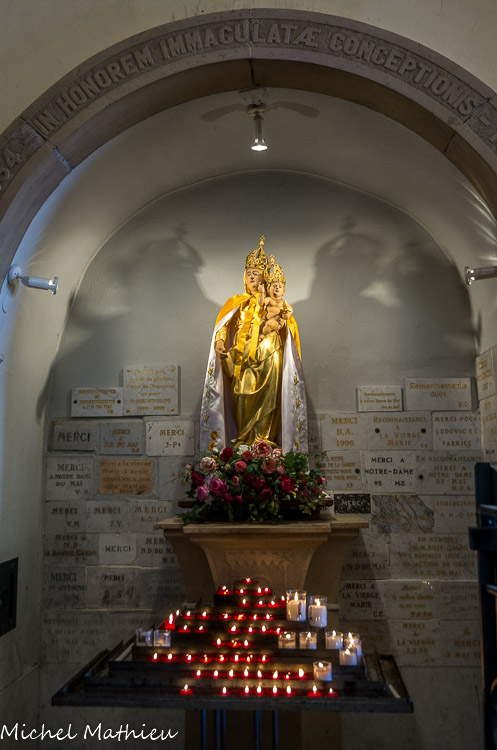Vitrail du mur sud, vers l’ouest : le miracle du mai. La tour de guet frappée par la foudre, la Bonne Mère protectrice porte son enfant dans ses bras, au loin un navire sur le mer. En partie inférieure, les lettres A et M entrelacée dans un écusson symbolisent l’Ave Marie, hommage à la Vierge.