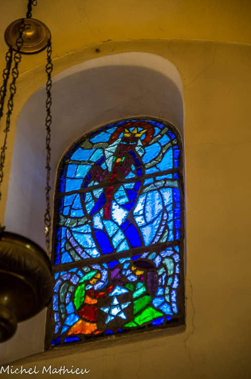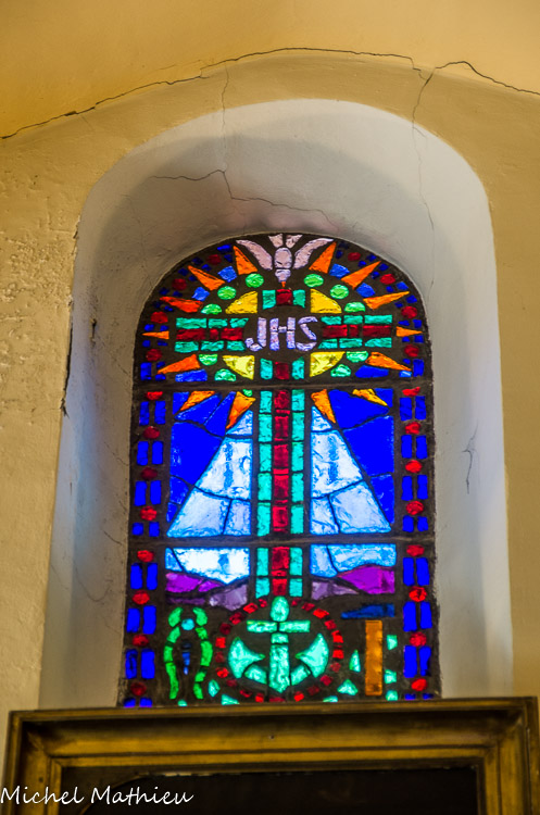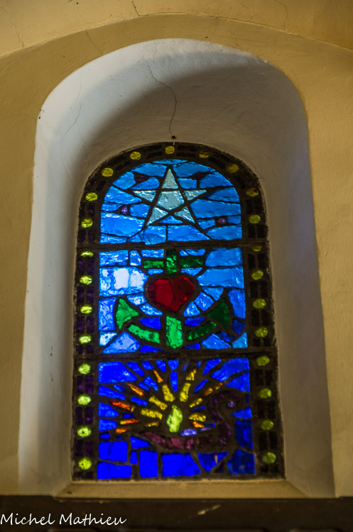 Les vitraux sont de Jacques Robinet, en 1954. Vitrail de la rosace est : l’eucharistie et la paix symbolisée par des colombes.