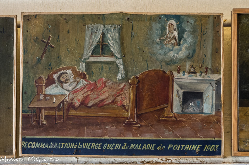 Le donateur y exprime ainsi sa foi en l’intercession de la vierge qui est généralement représentée dans une mandorle ou des nimbes dans la partie supérieure du tableau. On peut aussi rajouter à cette catégorie des peintures sur le sanctuaire de Notre Dame du Mai qui peuvent avoir également un caractère de témoignage gens historique. On dénombre environ 75 tableaux historiés dont le plus ancien date de 1835, leur examen attentif permet de relever de nombreuses indications sur la vie quotidienne de nos ancêtre ou de nos contemporains depuis cette date jusqu’à nos jours. Ils traitent de thèmes variés tels que la maladie (45 %), les accidents de la circulation (19 %), les accidents du travail (5 %), les accidents individuels (17 %) et enfin des événements divers ayant pour origine des causes naturelles (tempêtes, séismes, foudres, etc.) soit des causes humaines (folie, guerres, etc.)(14 %).