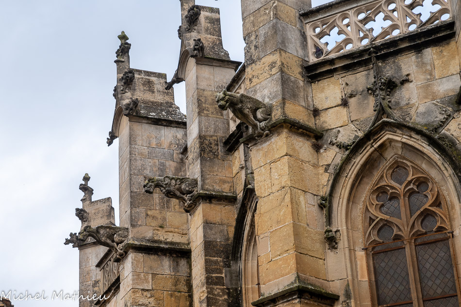 Eglise Saint Michel. Les gargouilles sont des gouttières qui servent à l’évacuation des eaux. Elles affectent la forme d’animaux qui sont des chef-d’œuvre de sculpture. Leur but symbolique est de faire fuir tout esprit malin. Les chenaux étaient en plomb.