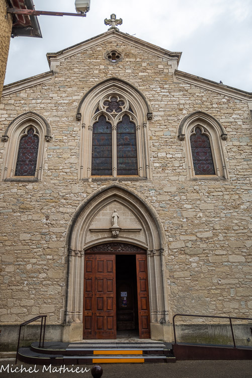 Le pignon de la façade était, avant 1914, percé d’un oculus, fermé par une verrière. Lors de la réfection du mur de façade, à partir de 1918 trois fenêtres gothiques, ornées de vitraux, furent réalisées enjolivant l’extérieur et éclairant l’intérieur. Ces travaux furent réalisés par M. GILLES, tailleur de pierres, sous la direction de l’architecte Valentin. Le sol de l’église est plus élevé de 0.75m que celui de la place. On accède à l’intérieur par trois marches.