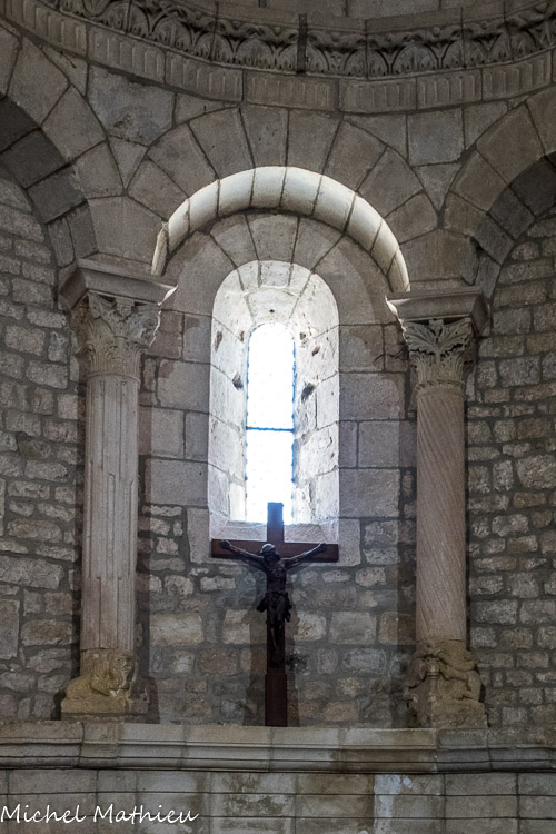 Lapins, têtes d’oiseaux, pampres de vignes. A la base, un être fabuleux qui a l’air de surgir et à la fois, supporter la colonnette.