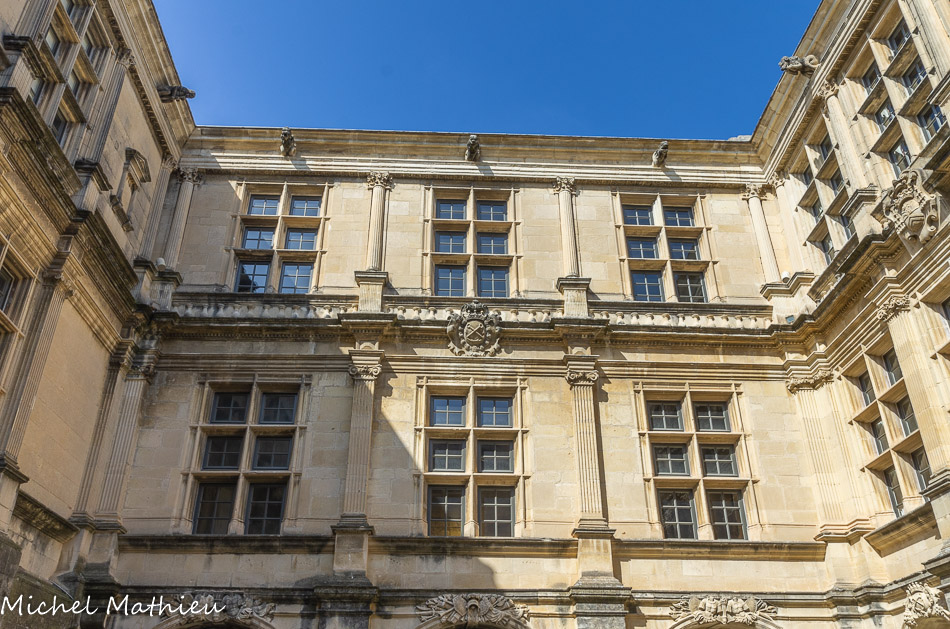 Cour d’honneur. La façade nord. Cette façade, dont le début de la construction date de 1551, est composée de 14 fenêtres à meneaux à double croisillon suivant la superposition classique des ordres antiques, comme sur les autres façades : les piliers toscans, sauf au sud, les pilastres ioniques et les demi-colonnes corinthiennes à base attique.